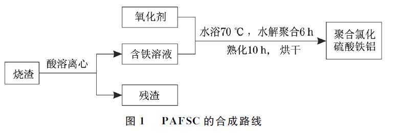 將一定量硫鐵礦燒渣置于三口燒瓶中,三端分別接溫度計、攪拌裝置和冷凝管.硫鐵礦燒渣經(jīng)高溫焙燒后,表面有一層致密的氧化膜,采用鹽酸和硫酸混酸酸溶。加入質(zhì)量分數(shù)為20%的HCl和H2SO4,硫鐵礦燒渣與混酸酸溶的固液比為1∶2.5,水浴加熱90℃,攪拌速度為180r/min,反應(yīng)3h,燒渣中鐵的浸出率達85.3%.完全反應(yīng)后將反應(yīng)物轉(zhuǎn)入離心管中以10?。埃埃埃颍恚椋铍x心3min.分離得到聚合反應(yīng)準備液,聚合反應(yīng)準備液進行水解聚合合成PAFSC.使水解聚合反應(yīng)得以順利進行的關(guān)鍵之處在于控制適宜的pH和鐵濃度.適宜的pH(質(zhì)量分數(shù)為1%的水溶液pH為2~3)可以使鋁鐵不斷進行水解反應(yīng)而不生成沉淀,鐵濃度的限定(Fe質(zhì)量分數(shù)大于等于12%)是為了得到合格的絮凝劑產(chǎn)品和較好的絮凝性能.本實驗硫鐵礦燒渣經(jīng)混酸酸溶,不需調(diào)節(jié)pH,同時保證了較高的鐵利用率.酸溶所得酸浸液Fe質(zhì)量分數(shù)為14.56%,質(zhì)量分數(shù)為1%的水溶液pH為2.16(GB14591—2006,聚合硫酸鐵,Fe質(zhì)量分數(shù)大于等于11%,質(zhì)量分數(shù)為1%的水溶液pH為2~3).液體加入三口燒瓶中,加入一定量的Al2O3(控制Al與Fe物質(zhì)的量比為1∶8),溫度為70℃,轉(zhuǎn)速為180r/min,加入一定量氯酸鈉作氧化劑(根據(jù)測定的Fe2+物質(zhì)的量的110%投加),水解聚合6h.反應(yīng)完全后,冷卻至室溫,熟化10h,得紅棕色液體.產(chǎn)品鹽基度檢測為11.3,Fe2+含量測定質(zhì)量分數(shù)為0.02%(GB14591—2006,聚合硫酸鐵,鹽基度8~16,Fe2+質(zhì)量分數(shù)小于等于0.1%),置于烘箱以105℃烘干,研磨成粉,備用.PAFSC的合成技術(shù)路線如圖1所示.