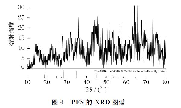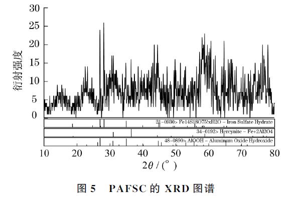用XRD測定PFS和PAFSC的晶體結(jié)構(gòu),分別如圖4和圖5所示.由圖4和圖5可知,存在晶體峰疊加在較多非晶態(tài)的漫射峰上,這表明PAFSC與PFS均輕微的結(jié)晶化.同時,PAFSC的峰與標準峰相比均有一定的偏移,這是由于晶格的收縮或膨脹引起的.XRD圖譜表明PFS和PAFSC中均含有硫酸鐵鹽,同時,由于Al?。常囊?,合成的PAFSC并未顯著改變結(jié)構(gòu),但生成了像鐵鋁尖晶石和羥基氧化鋁(圖5)等新的物相.