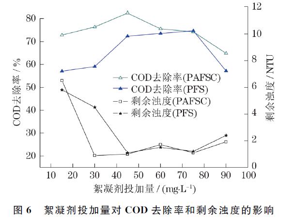 c.PAFSC在投加量為45mg/L時,COD和濁度去除率分別能達到82.4%和99%.相比PFS,合成的PAFSC具有更加高效穩(wěn)定的絮凝性能.復(fù)合絮凝劑的性能相較傳統(tǒng)絮凝劑更好,利用硫鐵礦燒渣的研究可致力于引入較高價態(tài)的陰離子來合成新型復(fù)合絮凝劑。
