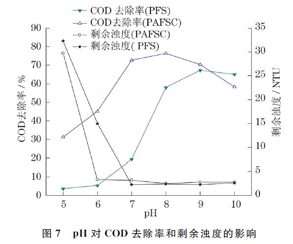 經(jīng)SEM,XRD和FTIR等方法表征,探究了PAFSC的結(jié)構(gòu)和形態(tài),PAFSC主要是羥基與鋁鐵橋連的聚合鐵鋁混合物.進一步探究PAFSC的絮凝性能,采用PAFSC和PFS處理生活廢水,在不同投加劑量以及不同pH條件下,測定其COD及濁度的去除率,對PAFSC的絮凝性能進行評價.不同的PAFSC投加量對COD以及濁度的去除率如圖6所示.其中,隨著PAFSC和PFS投加量不斷變大,剩余濁度先由大變小再變大.PAFSC的投加量由15mg/L至45mg/L,COD的去除率和剩余濁度分別不斷增大和減小.投加量達到45mg/L時,繼續(xù)投加絮凝劑,絮凝性能有所下降,這有可能是由絮凝劑電中和作用和吸附架橋兩種機制引起的.由于水體中帶有大量負電荷,膠體顆粒由于電荷的同性相斥而趨向形成一個分散穩(wěn)定的體系,加入帶有大量陽離子的PAFSC絮凝劑后,膠體表面的負電荷逐漸被中和而導致膠體顆粒脫穩(wěn),從而不斷凝聚絮凝和沉淀.但隨著加入的絮凝劑過量后,由于絮凝劑本身的特性,形成的絮體表面重新帶電而出現(xiàn)了再穩(wěn)定現(xiàn)象.而絮凝過程中的吸附架橋作用,投加量較低時,絮凝劑難以形成足夠多的架橋連接各個膠體顆粒.但投加過量時,缺少足夠多未被吸附的顆粒不斷連接在長鏈狀的橋上,同時顆粒變得更不穩(wěn)定.綜上所述,較佳絮凝反應(yīng)存在一個較適宜的絮凝劑投加量.絮凝實驗結(jié)果表明,PAFSC相比PFS有著更優(yōu)異的絮凝性能,在投加量為45mg/L時,COD去除率為82.4%,剩余濁度為1NTU(濁度去除率達99%).這可能是PAFSC相比于PFS,由于鋁的添加使得鐵鹽和鋁鹽不斷水解互相交聯(lián)、共聚,從而形成具有多核、更長、更穩(wěn)定的高分子聚合長鏈提升吸附架橋能力;同時,由于氯離子的引入,使鋁鐵共聚物的分子量和穩(wěn)定性得到一定的提升,也使多核共聚物的電荷量有所提高而促進了電中和作用.在使用絮凝劑處理廢水的絮凝過程中,污水的pH對絮凝效果影響較大.測定pH在5~10的范圍內(nèi),投加相同劑量的PAFSC和PFS,測定其COD的去除率及剩余濁度,結(jié)果如圖7所示.由圖7可知,pH在5~8時,PAFSC和PFS處理廢水時COD去除率不斷增大.這主要是因為在較低的pH條件下,溶液中陽離子過多抑制絮凝劑的水解.但隨著pH的增大,溶液中的羥基與絮凝劑會進一步反應(yīng),使得絮凝劑中未反應(yīng)或未完全反應(yīng)的鋁鐵進一步聚合,從而增強其吸附架橋的能力.同時,膠體的表面電荷因電中和作用電荷量不斷降低,促使懸浮物脫穩(wěn)不斷絮凝.然而,在更高的堿性環(huán)境中,絮凝劑會受到水中過多的OH-與本身所帶正電荷的電中和作用的影響,導致所帶電荷量減小,抑制絮凝過程中的電中和作用[22].此外,PAFSC在較寬的pH范圍內(nèi)處理效果均高于PFS,且在pH較小時,COD去除明顯優(yōu)于PFS.PAFSC相對于PFS,當pH在7~9時,能達到較佳的處理效果,應(yīng)用范圍更廣,絮凝性能也更加穩(wěn)定,PAFSC和PFS對濁度的去除隨著pH的增大先急劇減小后逐漸穩(wěn)定.但PAFSC與PFS對比,PAFSC在pH較低的廢水中有較好的濁度去除效果.