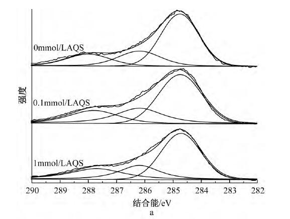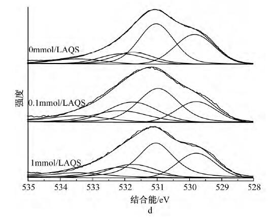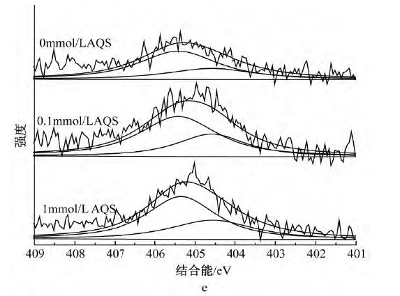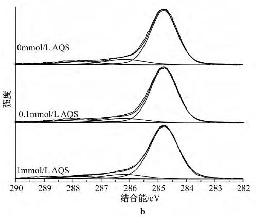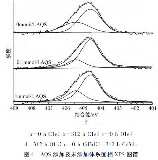 為了解AQS的存在是否影響Cd2+的吸附機(jī)理,采用XPS對(duì)體系中的C、O、Cd元素進(jìn)行分析。經(jīng)過(guò)XPSPeak4.1軟件分峰處理后,圖4a中C1s可擬合出3個(gè)峰,其中:284.8eV為C—C/C—H,是表面污染碳[21],286.2eV為C—OH,是MR-1菌表面的醇羥基或醚,287.7eV為C—OOH,是MR-1菌表面的羧基;表明MR-1菌體表面官能團(tuán)主要為羧基和醇羥基或醚。從圖4b中C1s可以看出:反應(yīng)平衡后所有體系中C—OH和C—OOH峰面積比均有所降低,說(shuō)明醇羥基或醚和羧基均參與了反應(yīng),而無(wú)AQS的體系峰面積比降幅更小,推測(cè)由于體系生成的二次礦物較多,增加了溶液中Cd2+的傳質(zhì)阻力,阻擋了菌體表面與溶液中游離離子的絡(luò)和。圖4cO1s中可擬合出3個(gè)峰:530.1,530.9,532.2eV分別對(duì)應(yīng)絮體中的Fe-O、MR-1菌表面的羧基、醇羥基或醚。圖4dO1s中,所有體系在531.1eV處均出現(xiàn)新峰Fe—OH,且有AQS體系的Fe—OH峰面積比略小于無(wú)AQS體系,與XRD分析結(jié)果吻合,說(shuō)明所形成的二次礦物中針鐵礦和磁鐵礦量(結(jié)晶度稍差)少于無(wú)AQS體系,且Fe—O發(fā)生了一定的位移,其中Fe—O包括未被還原絮體中的Fe—O和二次礦物中的Fe—O;另一個(gè)新峰為531.7eV處的Cd—O,且0.1mmol/LAQS峰面積比較大,原因是反應(yīng)前期釋放出來(lái)的Cd2+更多,菌體表面有機(jī)官能團(tuán)和二次礦物表面存在大量的羥基位點(diǎn)絡(luò)合了更多的Cd2+;所有體系中C—OH均發(fā)生了一定的位移,結(jié)合能均有增加,原因是C—OH中的O含有孤對(duì)電子,能與Cd共享電子從而發(fā)生配位絡(luò)合形成Cd—O,從而降低了O原子周邊的電子云密度。圖4e中Cd3d,404.59eV處為Cd—O,405.4eV處為PFS混凝Cd2+產(chǎn)生的峰[26]。而從圖4f中Cd3d可以看出:有AQS體系中Cd—O峰面積比無(wú)AQS體系大,與O1s圖譜中的Cd—O一致,其中Cd—O包括二次礦物和菌體表面有機(jī)官能團(tuán)結(jié)合Cd2+形成的Cd—O。