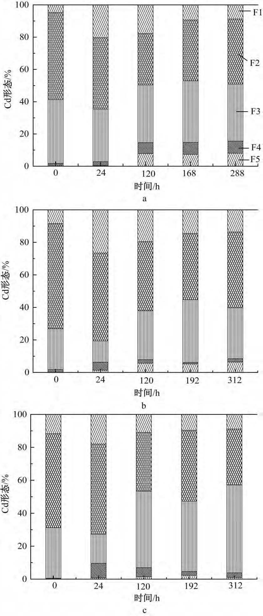 Cd形態(tài)的提取:在特定時(shí)間點(diǎn)將血清瓶中的樣品溶液離心,保存上清液測(cè)溶液中Cd2+,為F1態(tài);再將離心得到的固體沉淀進(jìn)行真空冷凍干燥得到固體粉末,采用連續(xù)提取法對(duì)體系固相中的Cd化學(xué)形態(tài)進(jìn)行提取。具體提取步驟如下: