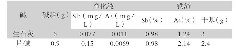 4.5 g PFS分別加入1500ml的廢水中后, 溶液p H為3, 分別用生石灰調(diào)配成20%的石灰乳和20%的片堿調(diào)節(jié)p H至6, 加1~2ml PAM助凝, 取上清液分析結(jié)果如表1。