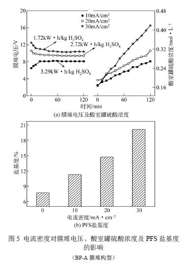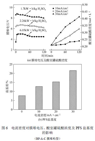 操作條件:反應(yīng)溫度設(shè)置為常溫,反應(yīng)時(shí)間設(shè) 置為120min,反應(yīng)原料組成為1.67mol/L H2SO4 和 4.30mol/L FeSO4(硫酸亞鐵和硫酸的摩爾比為 2.58),膜堆為BP-A-C 構(gòu)型,電流密度設(shè)置為0、 10mA/cm2、20mA/cm2、30mA/cm2。 圖6 是電流密度對(duì)膜堆電壓、酸室罐硫酸濃度 以及PFS 鹽基度的影響(BP-A-C 膜堆構(gòu)型)。對(duì)比 圖5 可知:,同樣的電流密度下,BP-A 構(gòu)型 的膜堆電壓要比BP-A-C 的高,因此BP-A 構(gòu)型的 膜堆能耗比BP-A-C 的高,主要原因是本實(shí)驗(yàn)中制 得的PFS 是無機(jī)高分子聚合物,其電導(dǎo)率較小,相 比BP-A 膜堆構(gòu)型,BP-A-C 膜堆構(gòu)型增加一個(gè)鹽室, 可以提供多余的電解質(zhì)離子導(dǎo)電,因此降低了膜堆電阻;第二,同樣的電流密度下,兩種膜堆構(gòu)型 較終得到的硫酸濃度相似;第三,相同的電流密 度下,兩種不同構(gòu)型膜堆制備出來的PFS 鹽基度 差別不大,因此,膜堆構(gòu)型對(duì)鹽基度的改善作用 不明顯。