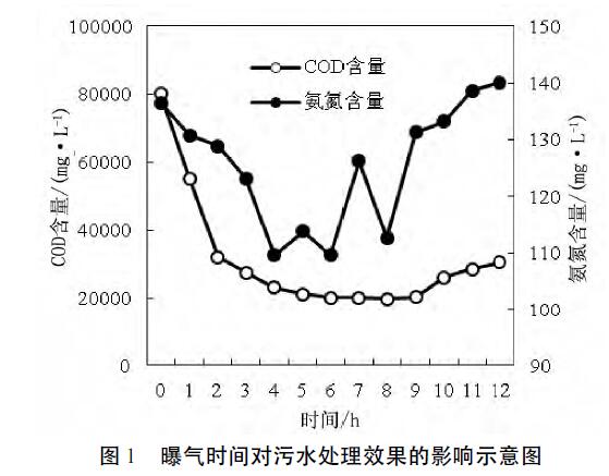 取1組6個(gè)250mL的錐形瓶,分別向其中加入100mL的待處理污水,然后向該污水中加入相當(dāng)于污水體積1%的菌液,即1mL的菌液,并且對污水進(jìn)行曝氣處理,曝氣量為4L/min,每隔一小時(shí)取樣記錄污水中的COD與氨氮含量,持續(xù)12h,通過觀察污水中COD與氨氮含量的變化,從而確定較佳的曝氣時(shí)間。