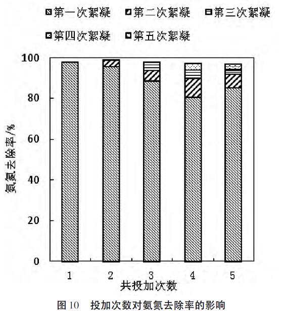 按照nFe2+/nH2O2為1:6的比例,F(xiàn)enton試劑按理論投加量的三倍進(jìn)行投加,反應(yīng)1.5h,COD的去除率達(dá)到了79.9%,經(jīng)處理之后的COD的含量仍高達(dá)1460mg·L-1,遠(yuǎn)遠(yuǎn)高于國家排放標(biāo)準(zhǔn)。根據(jù)化學(xué)反應(yīng)中少量多次的原則,可以將Fenton試劑總的投加量平均分為1、2、3、4、5份,然后分成多次進(jìn)行投加,對水體進(jìn)行氧化反應(yīng),考察不同投加次數(shù)對處理效果的影響,結(jié)果如圖9、10所示。將Fenton試劑平均分成4份,分次進(jìn)行投加時(shí),經(jīng)過四次氧化處理過程后,COD的去除率達(dá)到了97.6%,COD含量降至了175mg·L-1,已經(jīng)符合了國家排放標(biāo)準(zhǔn),另外由圖10可以看出,無論Fenton試劑分幾次加入,氨氮的去除率均達(dá)到98%以上,并且氨氮含量均低于國家排放標(biāo)準(zhǔn),因此綜合考慮Fenton試劑的較佳投加次數(shù)為4次。