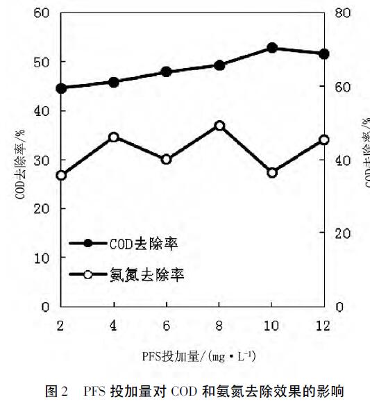 單獨(dú)投加不同含量的絮凝劑PFS對經(jīng)微生物處理過的含油污水中COD和氨氮的去除效果如圖2所示。