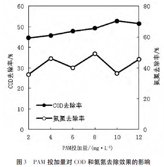 按照PFS的較佳投加量600mg·L-1的標(biāo)準(zhǔn)進(jìn)行投加,通過改變助凝劑PAM的投加量,測定絮凝后水樣中COD與氨氮的含量,考察助凝劑PAM對絮凝效果的影響,結(jié)果如圖3所示。