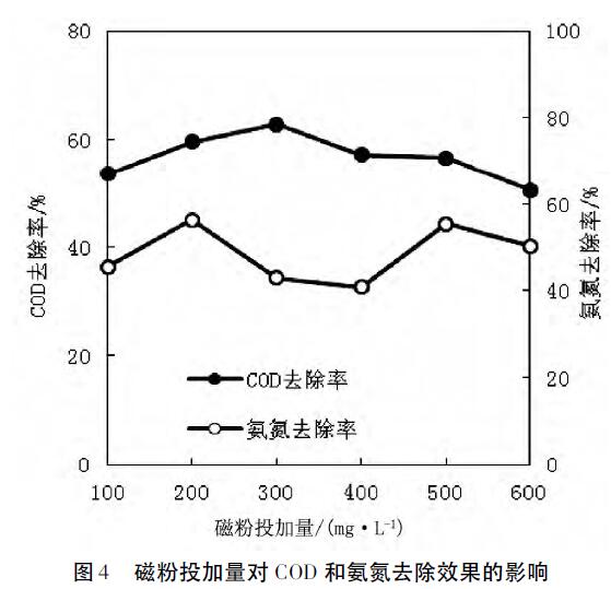 如圖4所示,磁粉的投加量為300mg·L-1時(shí),COD的去除率達(dá)到了較高值,為62.8%,比只加入PFS和PAM時(shí)的COD去除率高10.0%,這說明加入磁粉有利于提高絮凝效果。磁粉通過吸附-電中作用,同水中的懸浮顆粒一起做為絮體形成凝結(jié)核,形成磁性絮體,由于其重力較大,沉降速率加快,提高了絮凝效果。當(dāng)磁粉投入量過高時(shí),絮凝效果下降,顯然磁粉量加入量過高,會(huì)造成磁粉吸附其他的污染物,降低了COD的去除率。如圖4所示,隨著磁粉的投加量發(fā)生變化,水體氨氮的去除率呈現(xiàn)一個(gè)不規(guī)則的變化,說明磁粉的投加量與廢水中氨氮的去除沒有明顯的相關(guān)性,所以磁粉的較佳投加量應(yīng)該由COD的去除率所決定,確定為300mg·L-1。