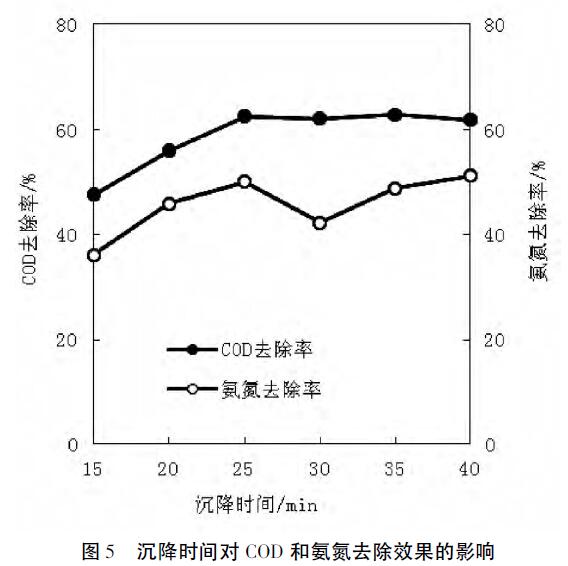 如圖5所示,沉降時(shí)間為25min時(shí),COD和氨氮的去除率分別達(dá)到62.5%和50.1%,此時(shí)氨氮去除率達(dá)到較高值。沉降時(shí)間為35min時(shí)COD去除率達(dá)到較高值,為62.8%,由于25min與35min時(shí)COD去除率相差僅僅0.3%,此差值可以忽略,因此綜合COD與氨氮的去除率,較佳沉降時(shí)間為25min。
