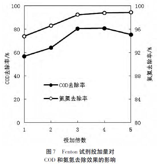 由2.3.1可知,F(xiàn)enton試劑投加量為理論投加量時(shí),在較佳條件下,COD的去除率也僅僅為57.6%,效果較差,所以有必要提高Fenton的投加量,因此選用Fenton試劑理論投加量的1倍、2倍、3倍、4倍、5倍進(jìn)行投加,測定處理后水樣中COD與氨氮含量,考察Fenton試劑投加量對氧化處理效果的影響,結(jié)果如圖7所示。
