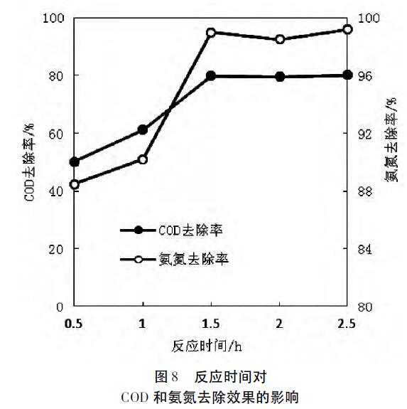 如圖8所示,反應(yīng)時(shí)間為1.5h時(shí),COD的去除率達(dá)到了較高值79.9%,反應(yīng)時(shí)間繼續(xù)增加時(shí),COD的去除率變化幅度很小,基本可以忽略不計(jì)。如圖15,反應(yīng)時(shí)間為1.5h以及以上時(shí),氨氮的去除率均達(dá)到了98%以上,綜合考慮較佳反應(yīng)時(shí)間為1.5h。